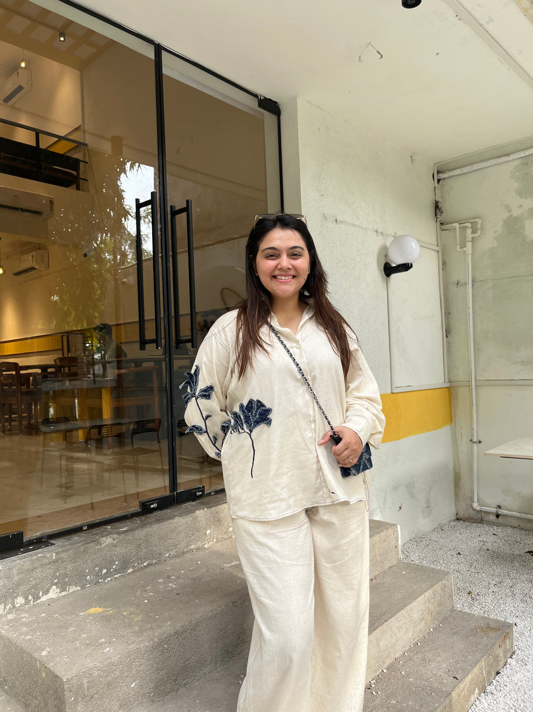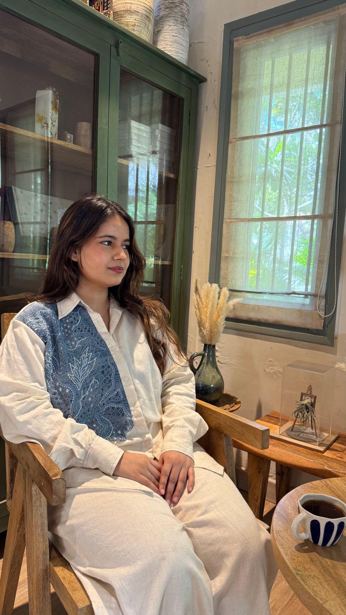 Description:A relaxed linen shirt and pants set featuring a floral denim patch detail. Easygoing and...