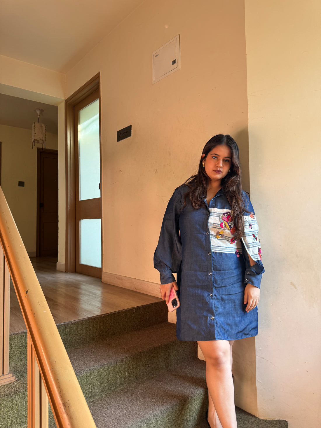 Description:A short soft denim dress featuring vibrant floral embroidery and open sleeves. Sweet, breezy, and...