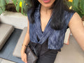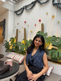 A black linen wrap top with a belt and matching trousers, finished with a bold denim patch detail. Tailored and tonal, this coord set is designed to make a statement with its sleek yet edgy look.