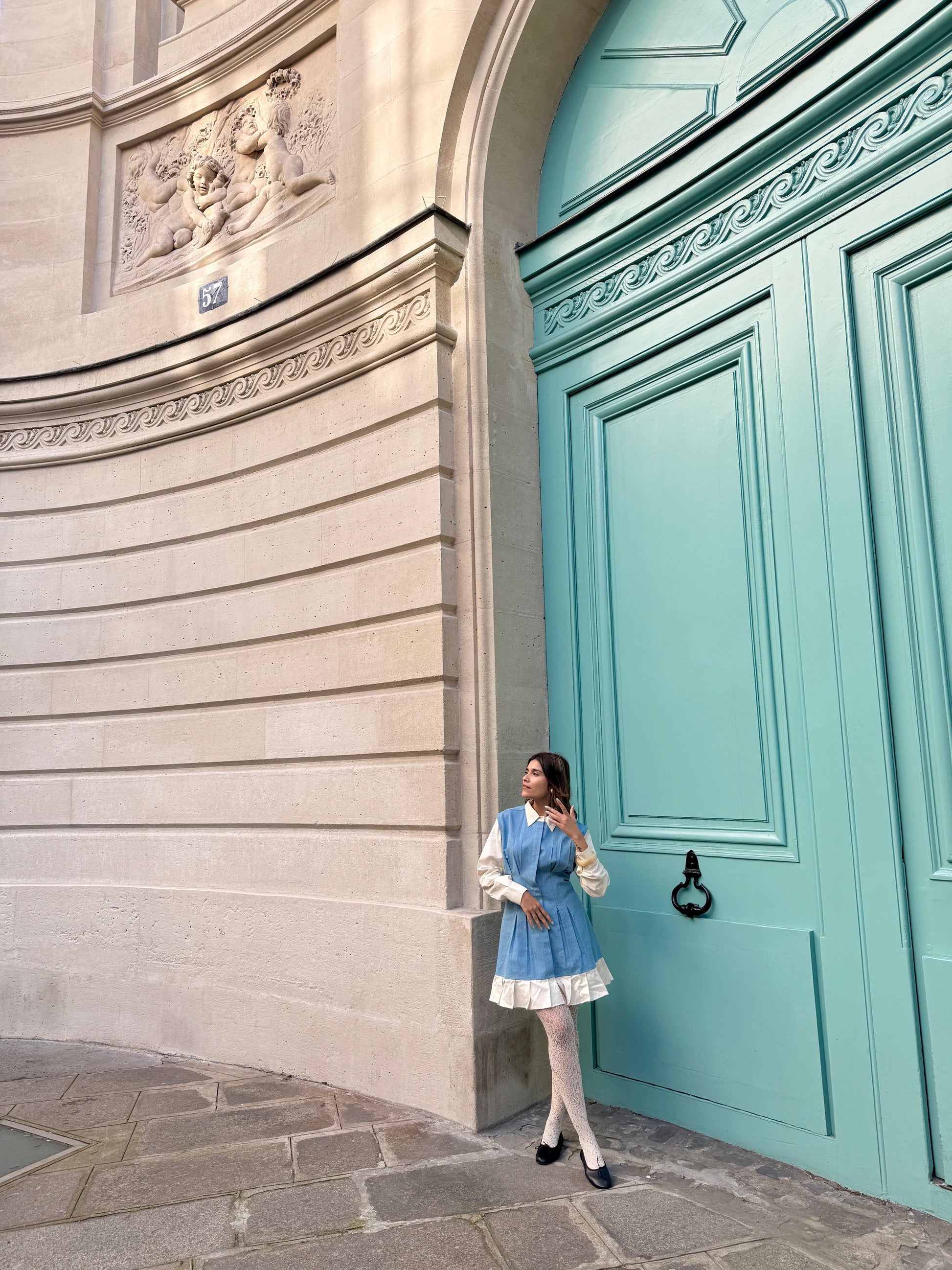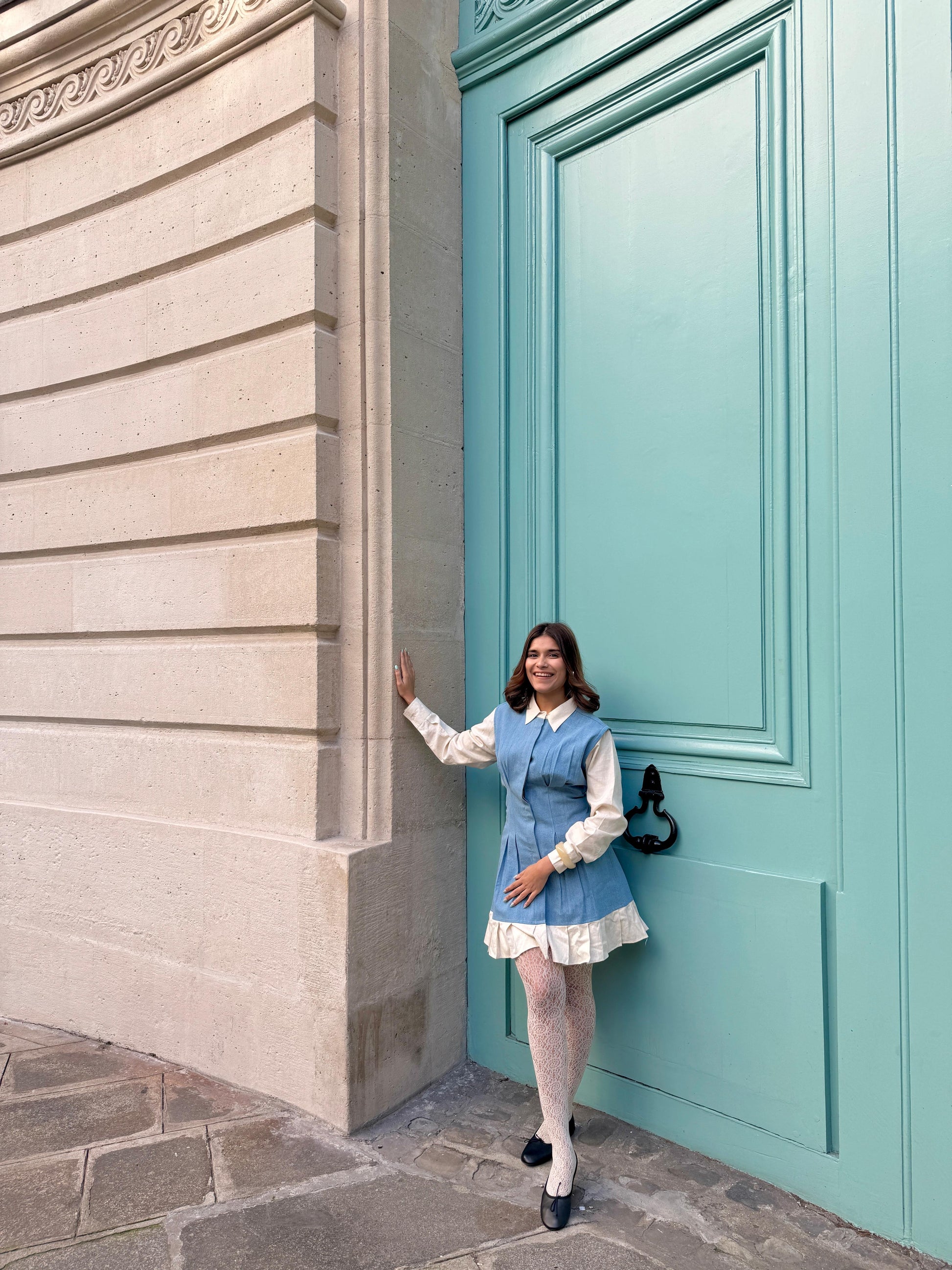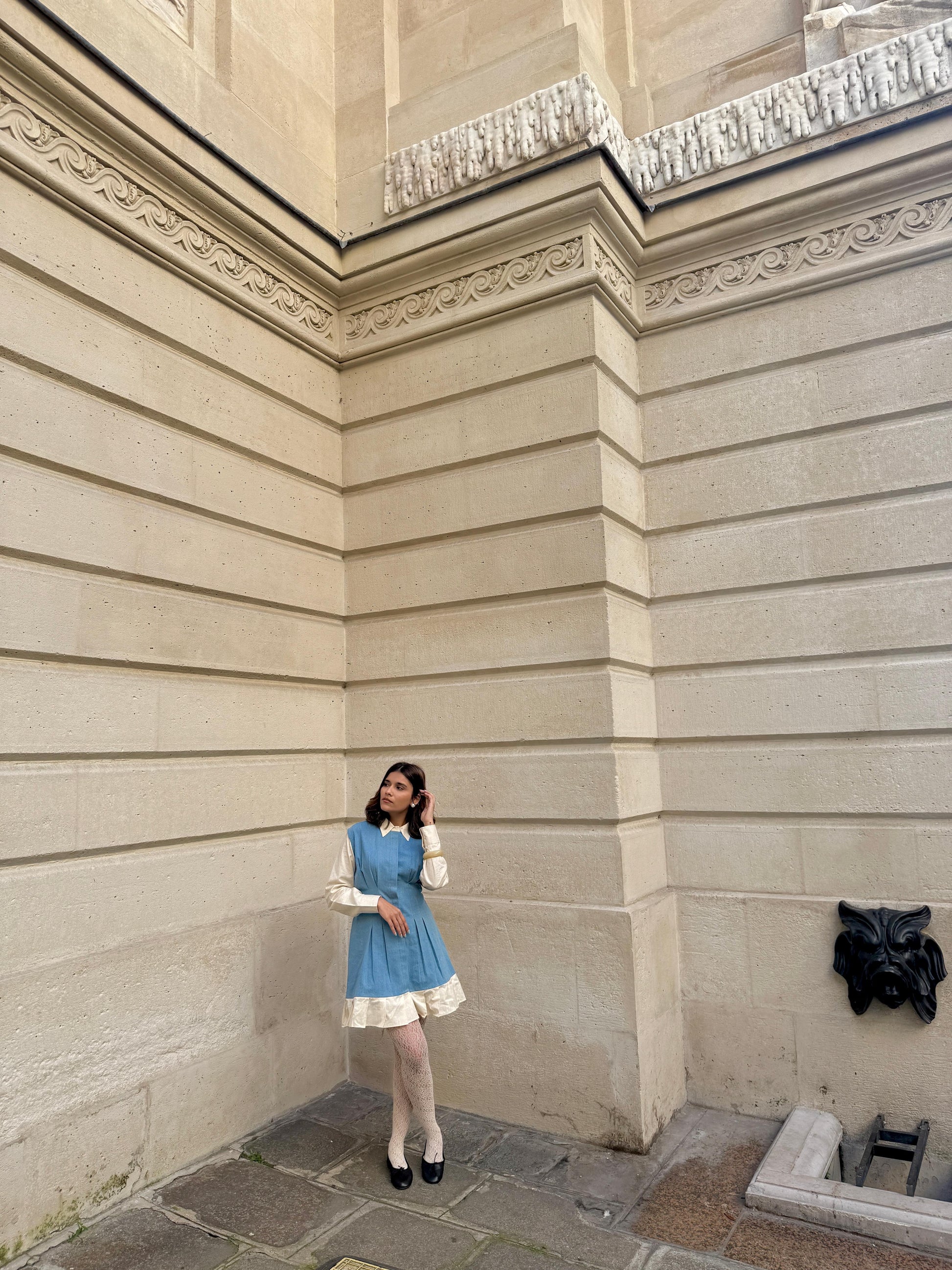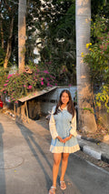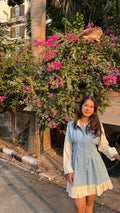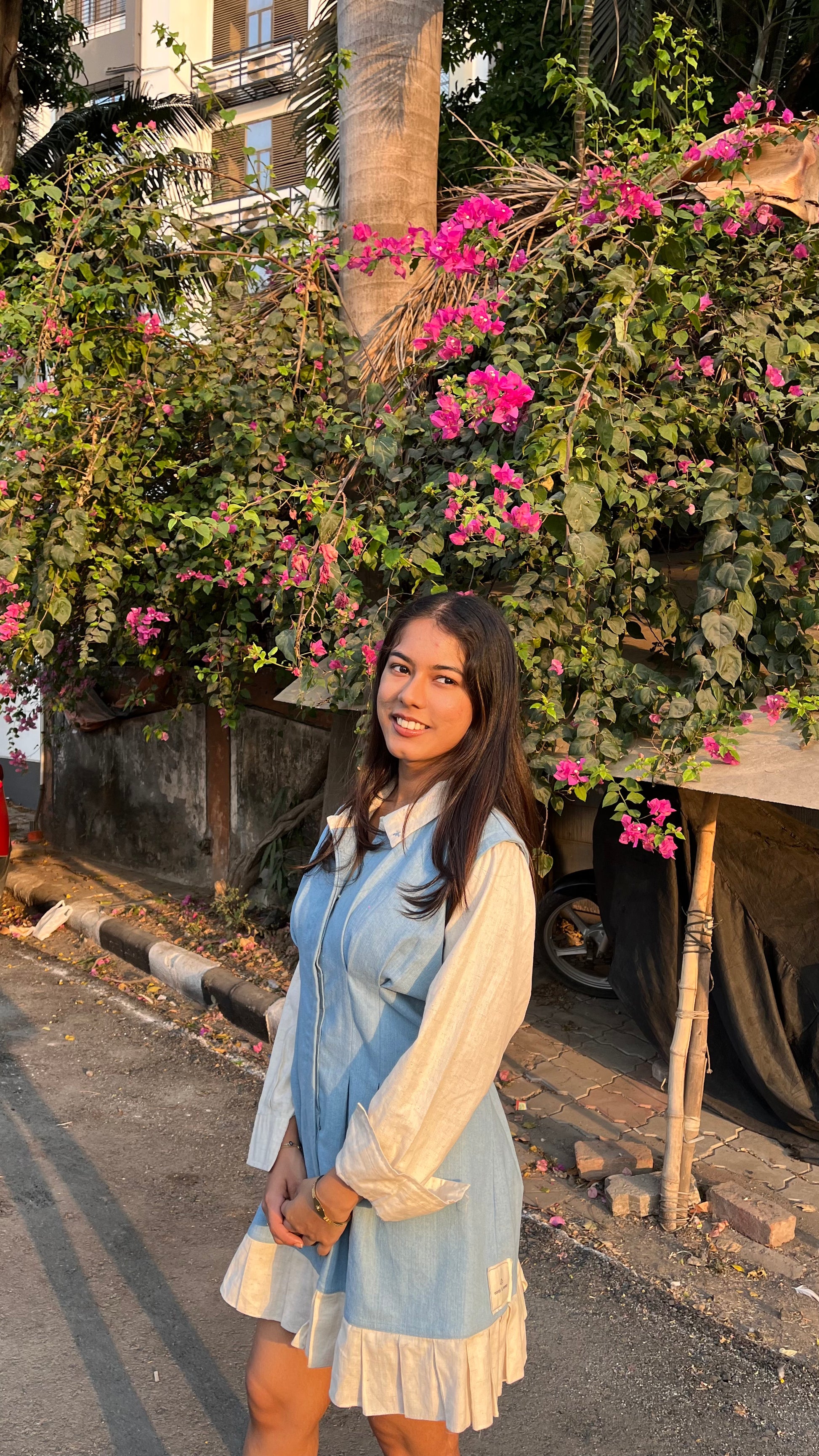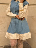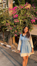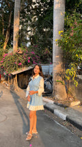 A flirty pleated mini denim dress featuring a linen collar, sleeves, and pleats. Fun, fresh, and perfect for playful days or stylish outings.
